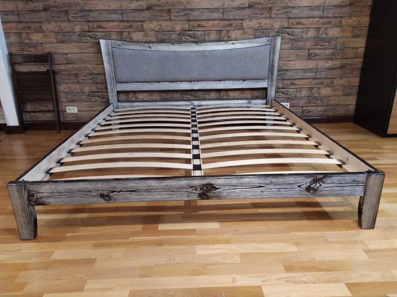 Кровать двухспальная с мягким изголовьем из натурального дерева Аврора, массив сосны, цвет венге с серебряной патиной.